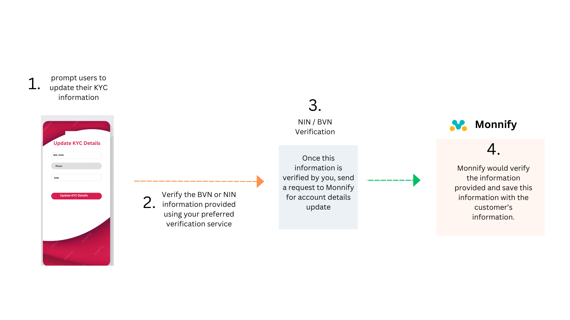 Verify the BVN or NIN information provided using your preferred verification service (as indicated in the description sections above)Once this information is verified by you, send a request to Monnify for account details update via this